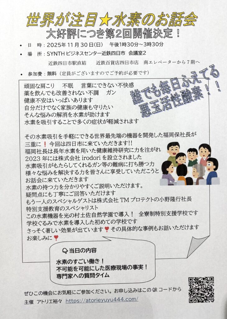 お知らせ&ブログ HOMEお知らせ世界が注目★水素[…] 202510.2 世界が注目★水素のお話会 お知らせ 大好評につき第2回開催決定! 今回は近鉄四日市駅直結の会場です。11月30日(日)ぜひ気軽にご参加ください。無料です! 前へ 次へ